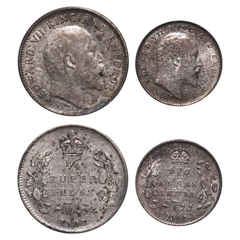 | Edward VII, Silver, (2 coins), 1) 1/4 Rupee, 1907, Calcutta Mint, No mint mark, 2) 2 Annas, 1904, Calcutta Mint, No mint mark. F. Prid 436, 557. GK 976, 981. About Uncirculated to Almost Uncirculated, Toned. Very Scarce. |