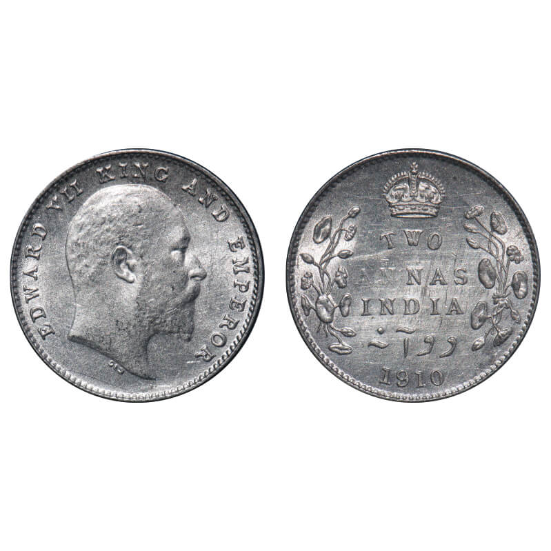 Edward VII, Silver, 2 Annas, 1910, Calcutta Mint, No mint mark. F. Prid 563. GK 987. Extremely Fine...