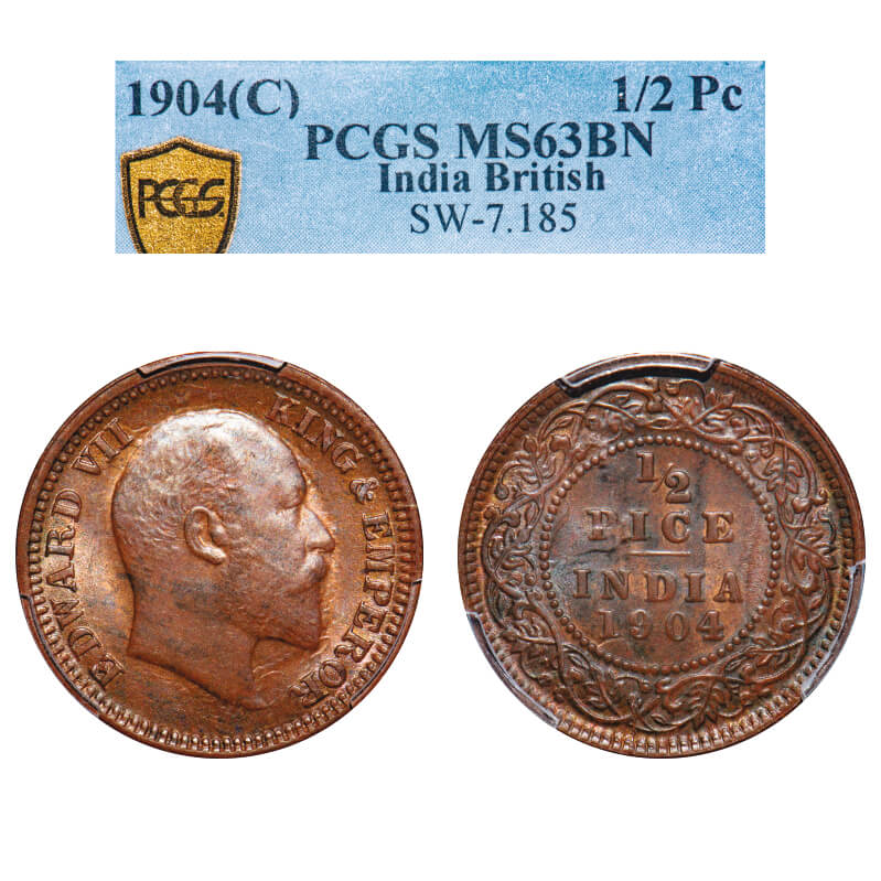 Edward VII, Copper, 1/2 Pice, 1904, Calcutta Mint, No mint mark. F. Prid 736. GK 1004. PCGS Slabbed MS 63 BN. Extremely Rare.