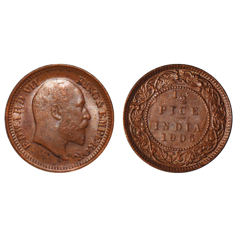 Edward VII, Copper, 1/2 Pice, 1905, Calcutta Mint, No mint mark, Ghost on Rev, Die crack on Obv. F. Prid 738. GK 1005. Uncirculated. Rare.