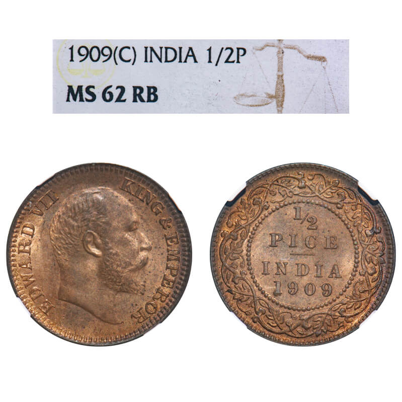 Edward VII, Bronze, 1/2 Pice, 1909, Calcutta Mint, No mint mark. F. Prid 743. GK 1010. NGC Slabbed MS 62 RB. Very Rare.