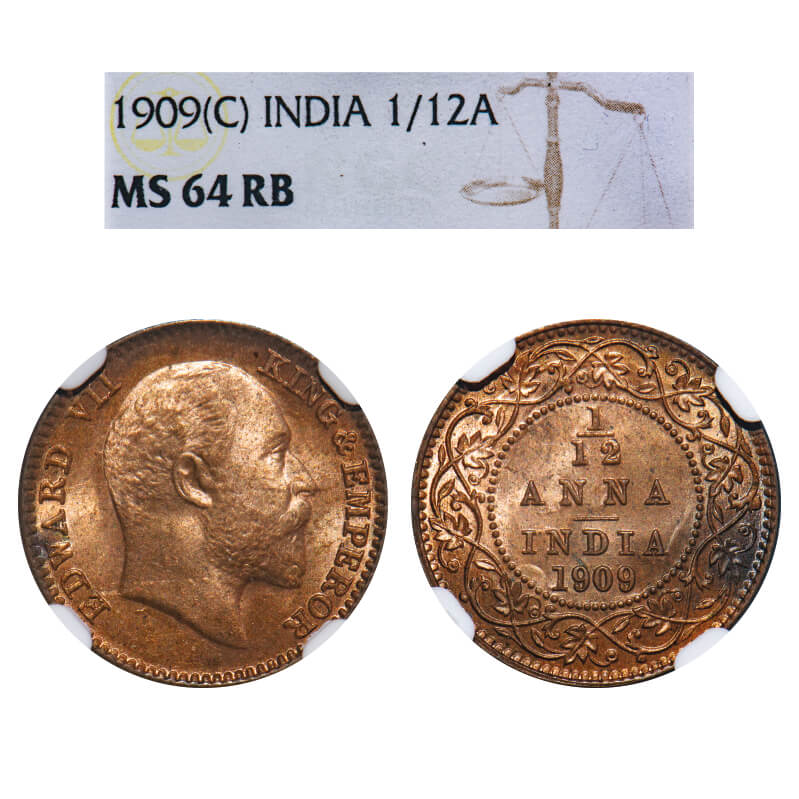 Edward VII, Bronze, 1/12 Anna, 1909, Calcutta Mint, No mint mark. F. Prid 825. GK 1019. NGC Slabbed MS 64 RB. Extremely Rare.