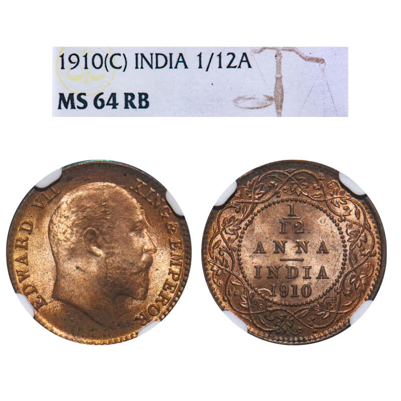 Edward VII, Bronze, 1/12 Anna, 1910, Calcutta Mint, No mint mark. F. Prid 826. GK 1020. NGC Slabbed MS 64 RB. Extremely Rare.