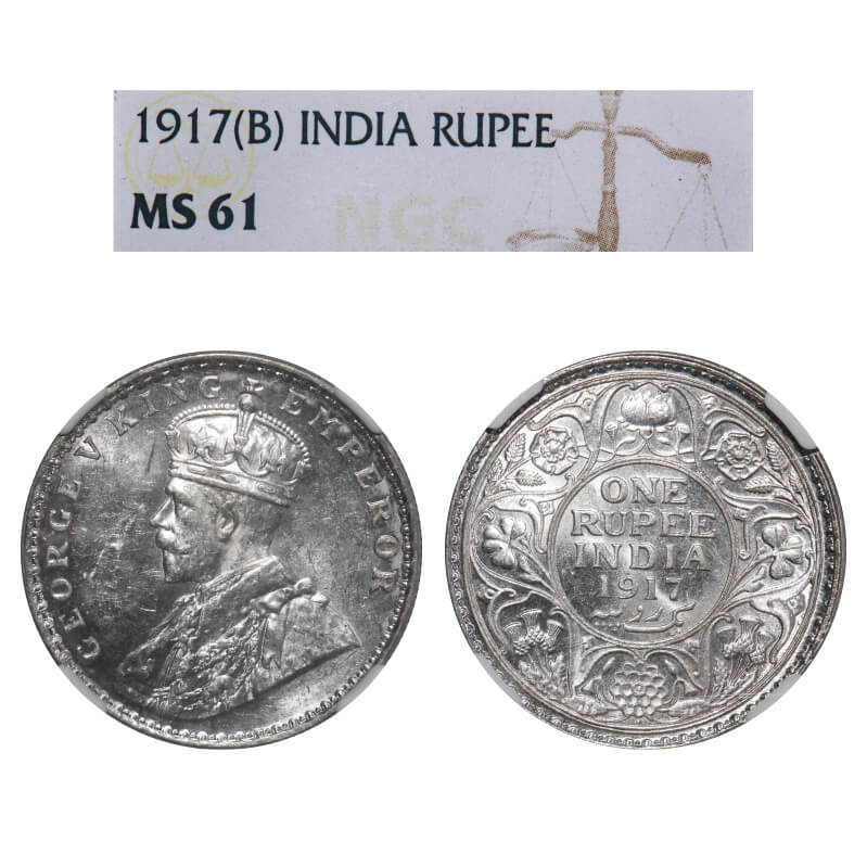 George V, Silver, Rupee, 1917, Bombay Mint, Dot, Elephant. F. Prid 223. GK 1036. NGC Slabbed MS 61. Rare.
