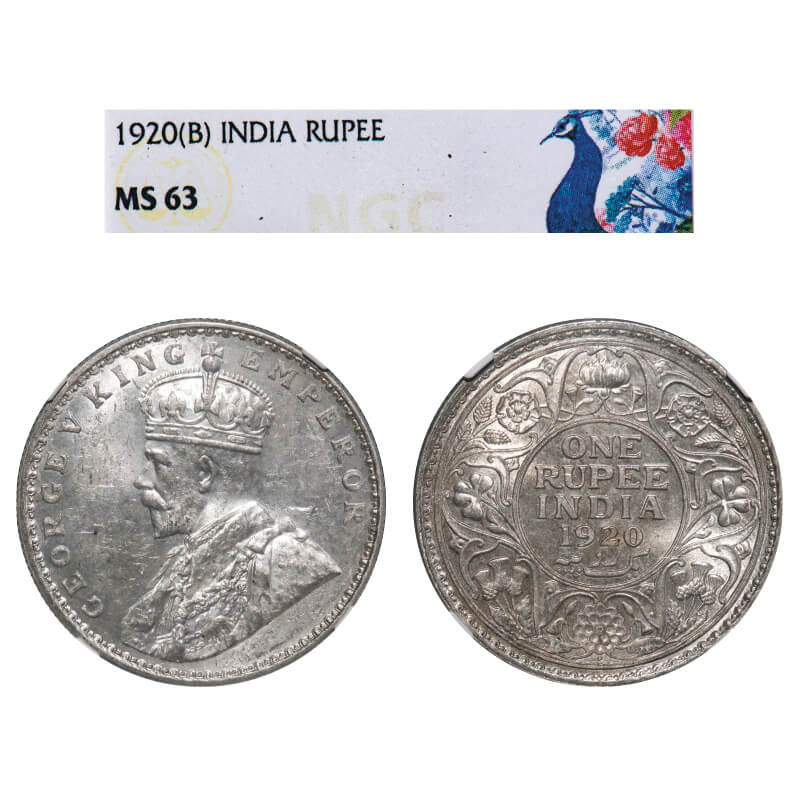 George V, Silver, Rupee, 1920, Bombay Mint, Dot, Elephant. F. Prid 226. GK 1042. NGC Slabbed MS 63. Very Rare.