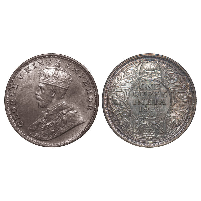 | George V, Silver, Rupee, 1921, Bombay Mint, Dot, Elepahnt, Struck through Error on Obv. F. Prid 227. GK 1043. Uncirculated, Toned. Rare. |