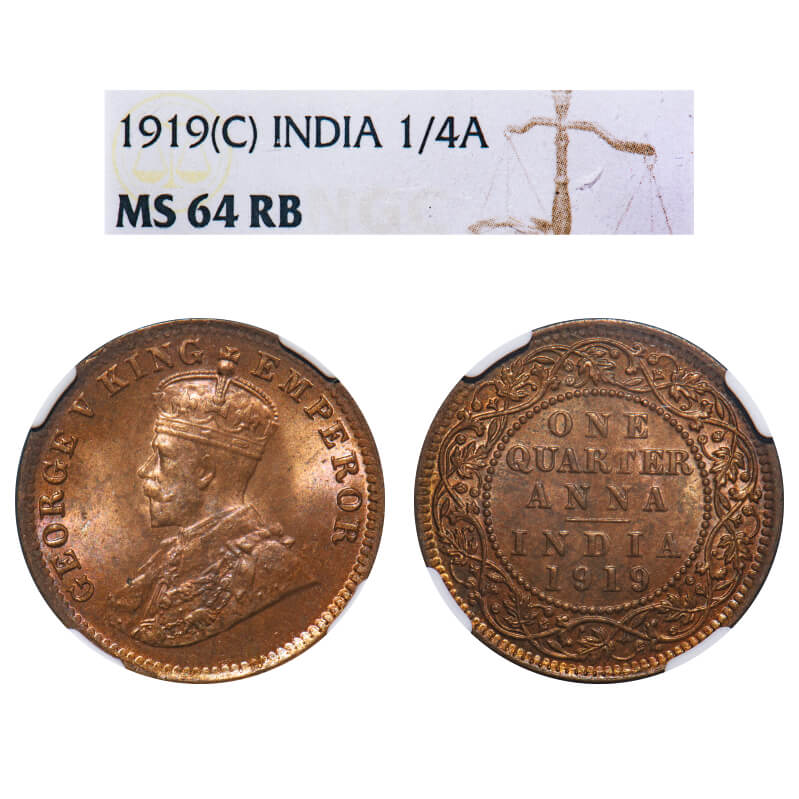 George V, Bronze, Quarter Anna, 1919, Calcutta Mint, No dot, Elephant. F. Prid 664. GK 1178. NGC Slabbed MS 64 RB. Extremely Rare.