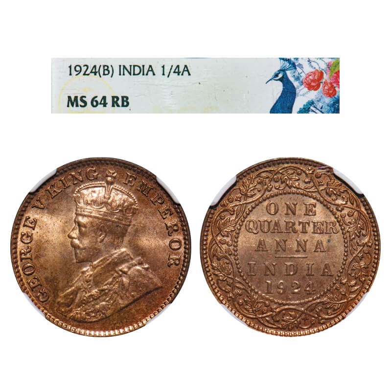 George V, Bronze, Quarter Anna, 1924, Bombay Mint, Dot, Elephant. F. Prid 677. GK 1180. NGC Slabbed MS 64 RB. Extremely Rare.
