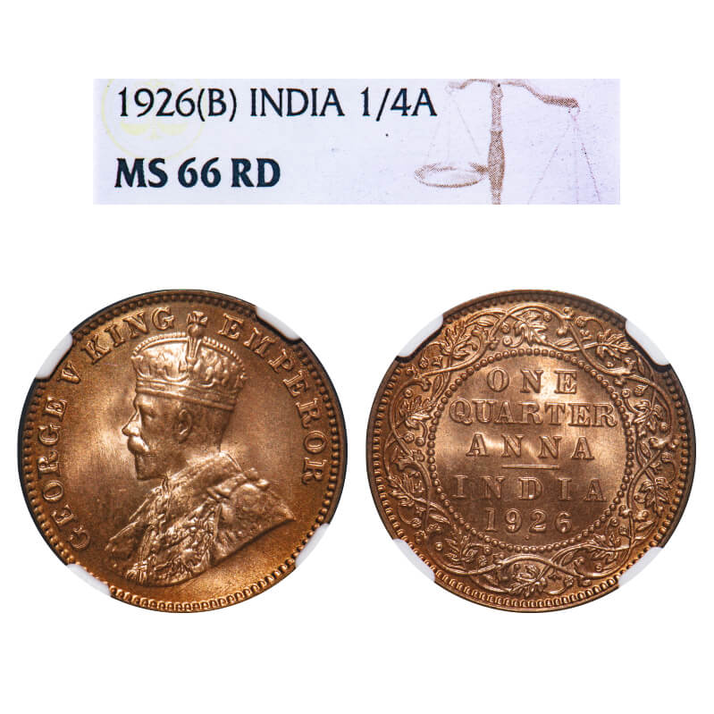 George V, Bronze, Quarter Anna, 1926, Bombay Mint, Dot, Elephant. F. Prid 679. GK 1183. NGC Slabbed MS 66 RD. Exceedingly Rare.