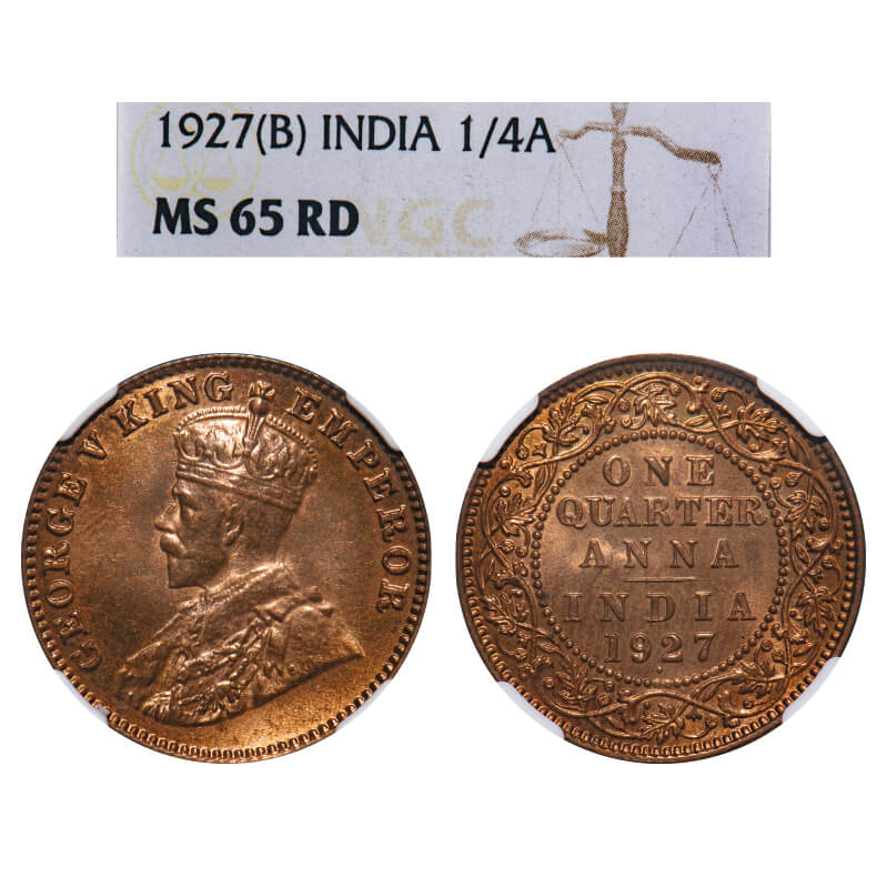 George V, Bronze, Quarter Anna, 1927, Bombay Mint, Dot, Elephant. F. Prid 680. GK 1185. NGC Slabbed MS 65 RD. Extremely Rare.