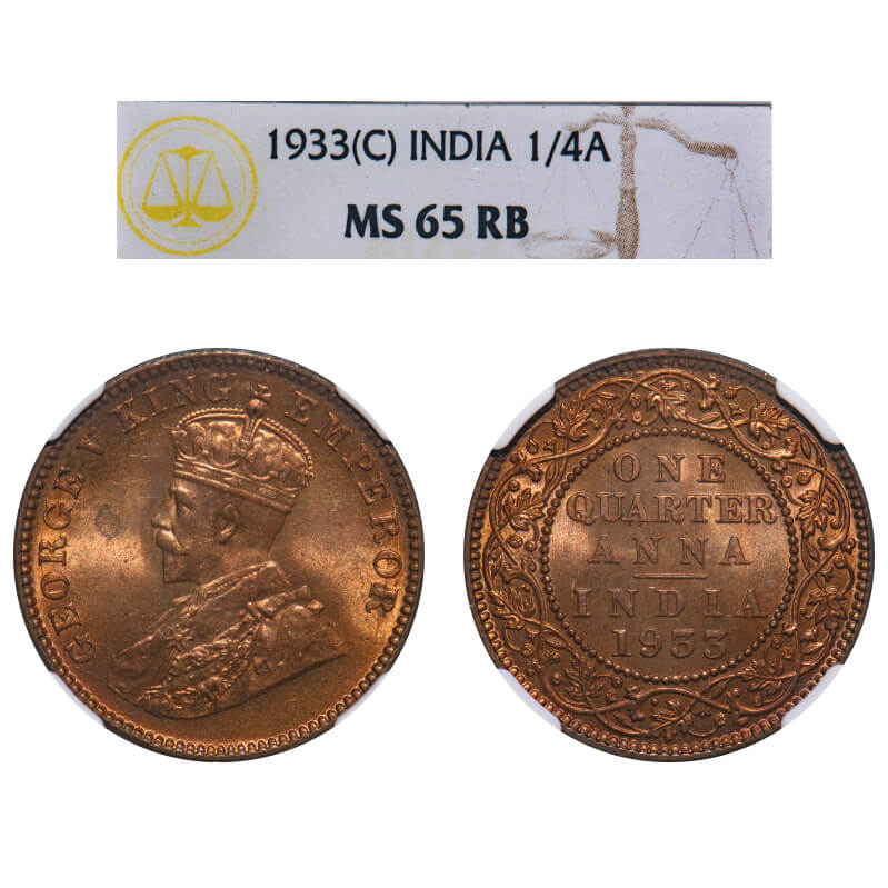 George V, Bronze, Quarter Anna, 1933, Calcutta Mint, No dot, Elephant. F. Prid 673. GK 1193. NGC Slabbed MS 65 RB. Extremely Rare.