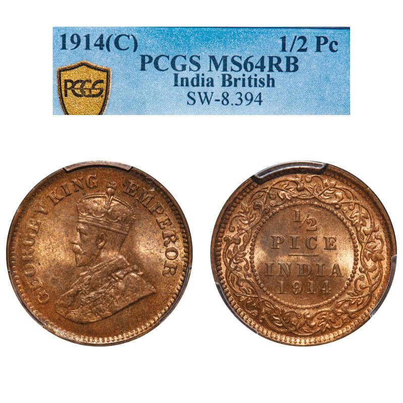 George V, Bronze, 1/2 Pice, 1914, Calcutta Mint, No mint mark. F. Prid 747. GK 1200. PCGS Slabbed MS 64 RB. Extremely Rare.