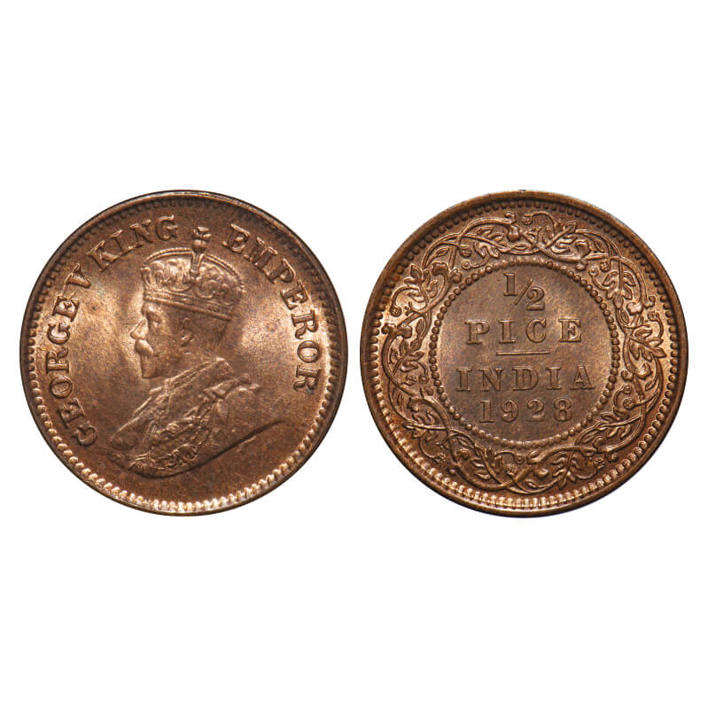 George V, Bronze, 1/2 Pice, 1928, Calcutta Mint, No mint mark. F. Prid 761. GK 1214. Mint State. Rare.
