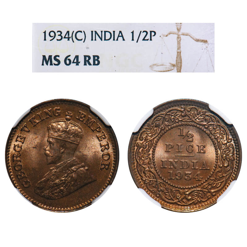 George V, Bronze, 1/2 Pice, 1934, Calcutta Mint, No mint mark. F. Prid 767. GK 1220. NGC Slabbed MS 64 RB. Very Rare.