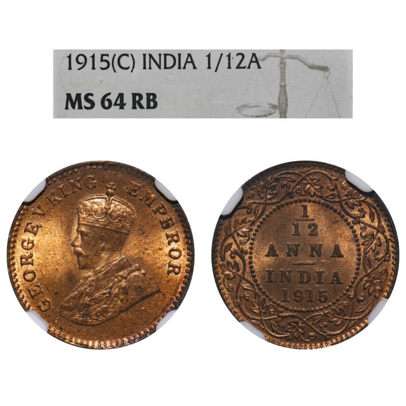 George V, Bronze, 1/12 Anna, 1915, Calcutta Mint, No dot. F. Prid 830. GK 1226. NGC Slabbed MS 64 RB. Extremely Rare.