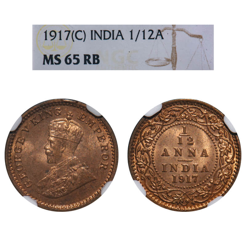 George V, Bronze, 1/12 Anna, 1917, Calcutta Mint, No dot. F. Prid 832. GK 1228. NGC Slabbed MS 65 RB. Extremely Rare.