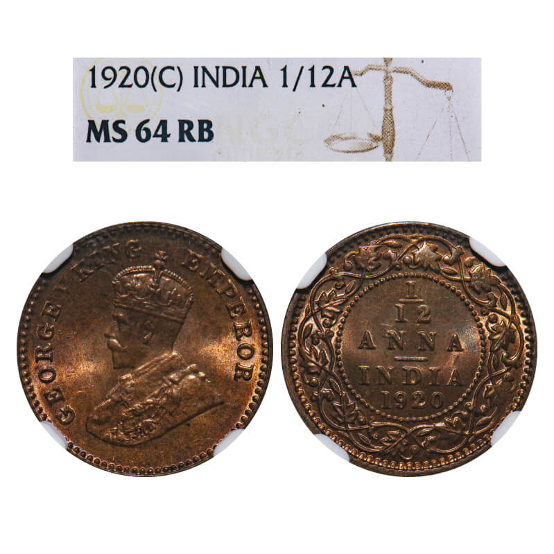 George V, Bronze, 1/12 Anna, 1920, Calcutta Mint, No dot. F. Prid 835. GK 1231. NGC Slabbed MS 64 RB. Very Rare.