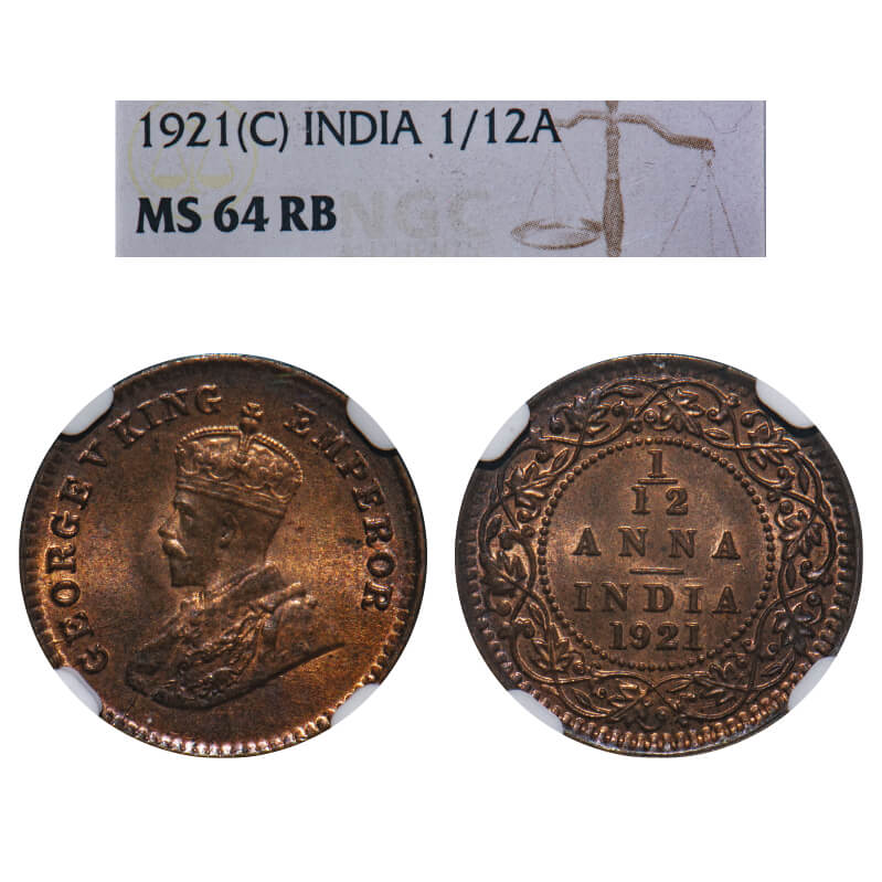 George V, Bronze, 1/12 Anna, 1921, Calcutta Mint, No dot. F. Prid 836. GK 1232. NGC Slabbed MS 64 RB. Very Rare.