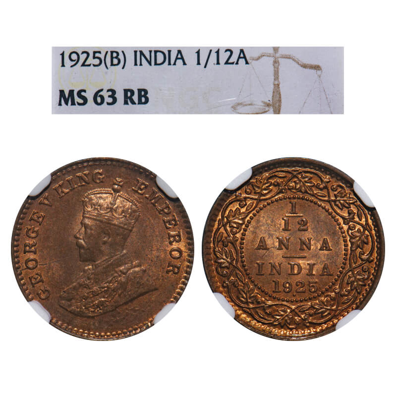 George V, Bronze, 1/12 Anna, 1925, Bombay Mint, Dot. F. Prid 853. GK 1237. NGC Slabbed MS 63 RB. Very Rare.