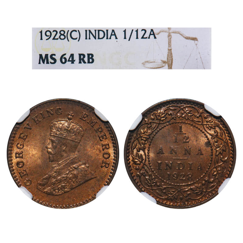 George V, Bronze, 1/12 Anna, 1928, Calcutta Mint, No dot. F. Prid 842. GK 1244. NGC Slabbed MS 64 RB. Very Rare.