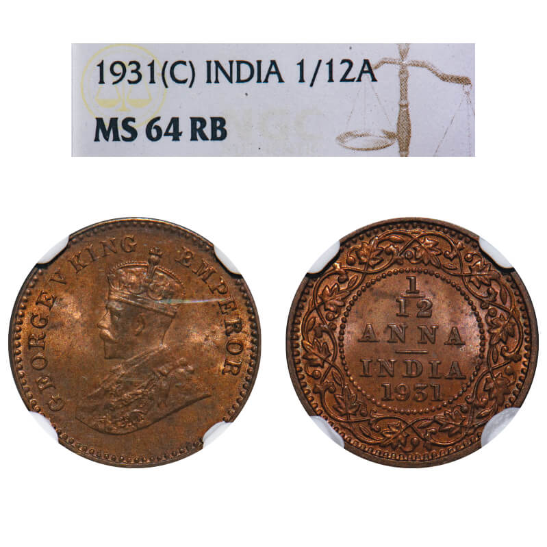 George V, Bronze, 1/12 Anna, 1931, Calcutta Mint, No dot. F. Prid 845. GK 1247. NGC Slabbed MS 64 RB. Extremely Rare.