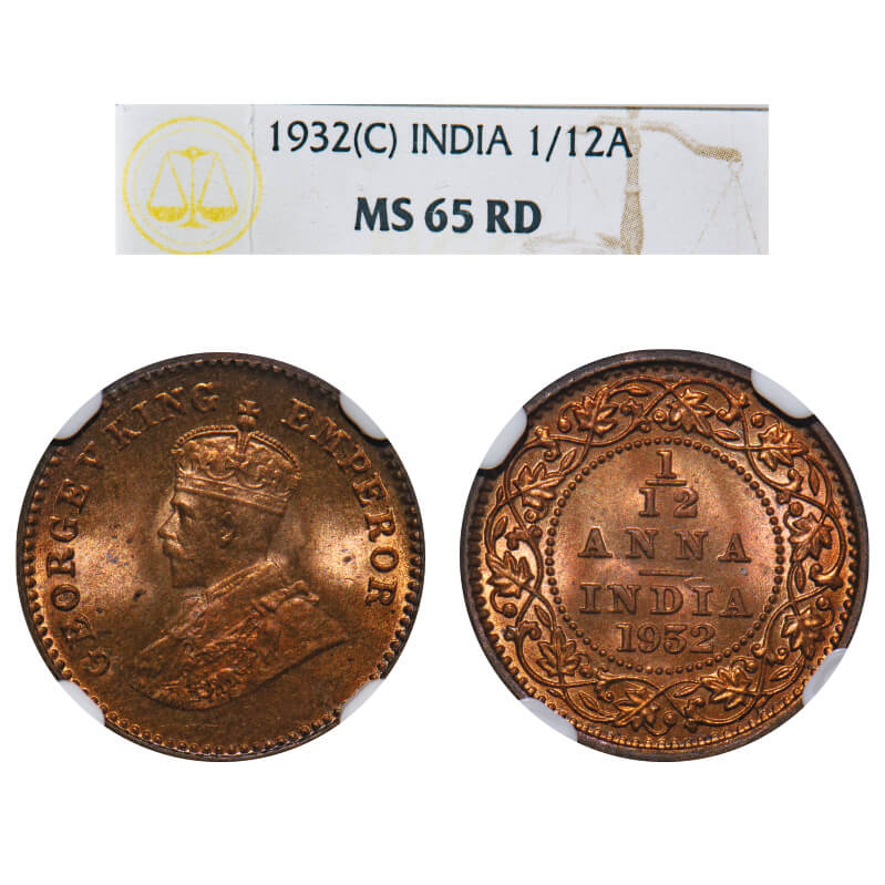 George V, Bronze, 1/12 Anna, 1932, Calcutta Mint, No dot. F. Prid 846. GK 1248. NGC Slabbed MS 65 RD. Extremely Rare.
