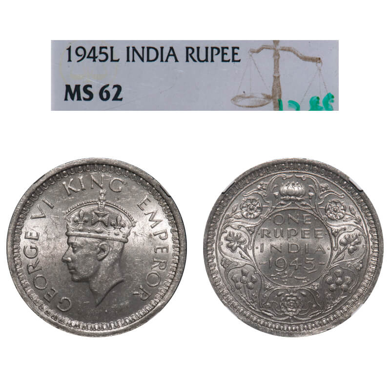 | George VI, Half Silver, Rupee, 1945, Lahore Mint, D/II, 'L' raised, Security edge, Normal 5, Thick L. F. Prid 248. GK 1288. NGC Slabbed MS 62. Very Rare. |