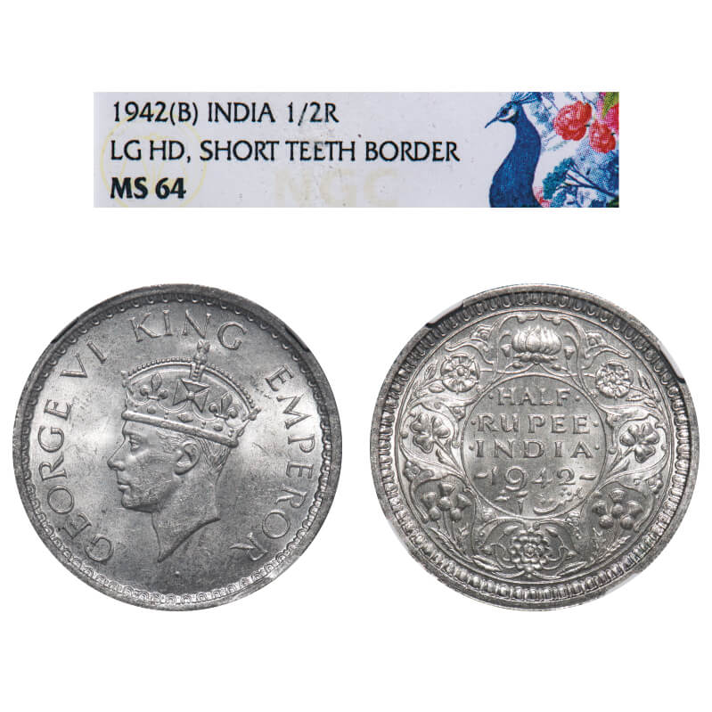 | George VI, Half Silver, Half Rupee, 1942, Bombay Mint, A(a)/II, Dot, Head Type II, Security edge. F. Prid 356. GK 1303. NGC Slabbed MS 64. Extremely Rare. |