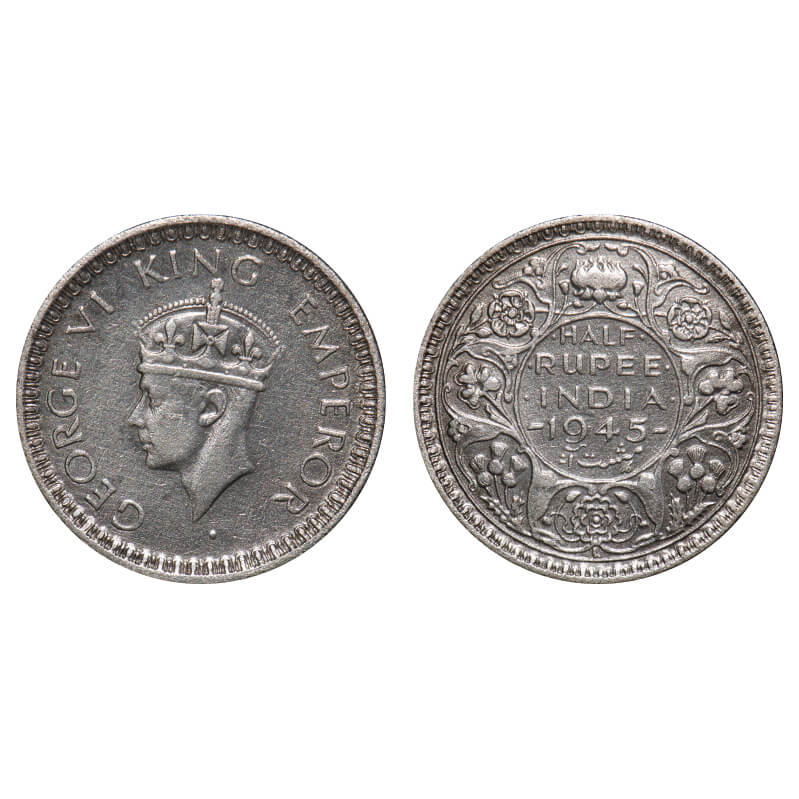 George VI, Half Silver, Half Rupee, 1945, Bombay Mint, B/II, Dot, Head Type II, Security edge, Rev ...