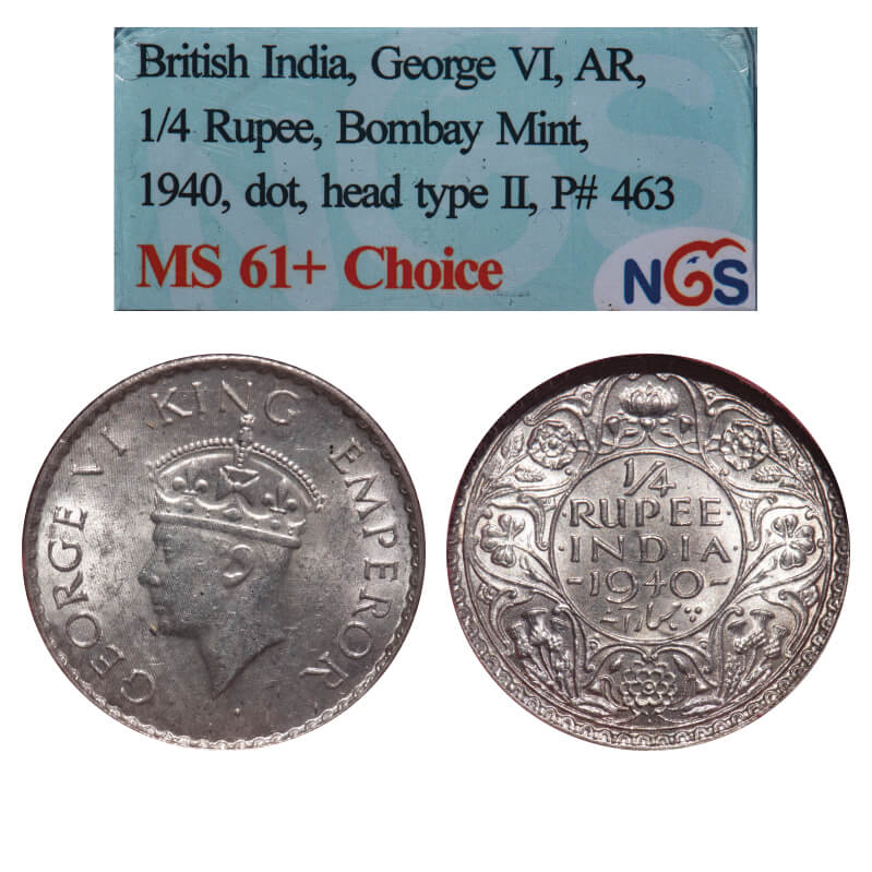 George VI, Half Silver, 1/4 Rupee, 1940, Bombay Mint, Dot, Head Type II, Rev I, Milled edge. F. Pri...
