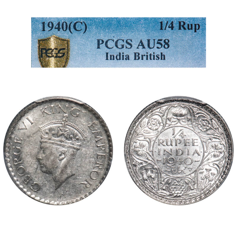| George VI, Half Silver, 1/4 Rupee, 1940, Calcutta Mint, Head Type II, Rev I, No dot, Milled edge. F. Prid 473. GK 1328. PCGS Slabbed AU 58. Rare. |