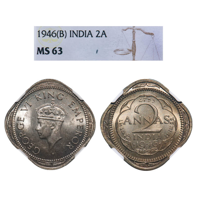 George VI, Copper-Nickel, 2 Annas, 1946, Bombay Mint, Dots by year, Head Type II. F. Prid 922. GK 1370. NGC Slabbed MS 63. Very Rare.