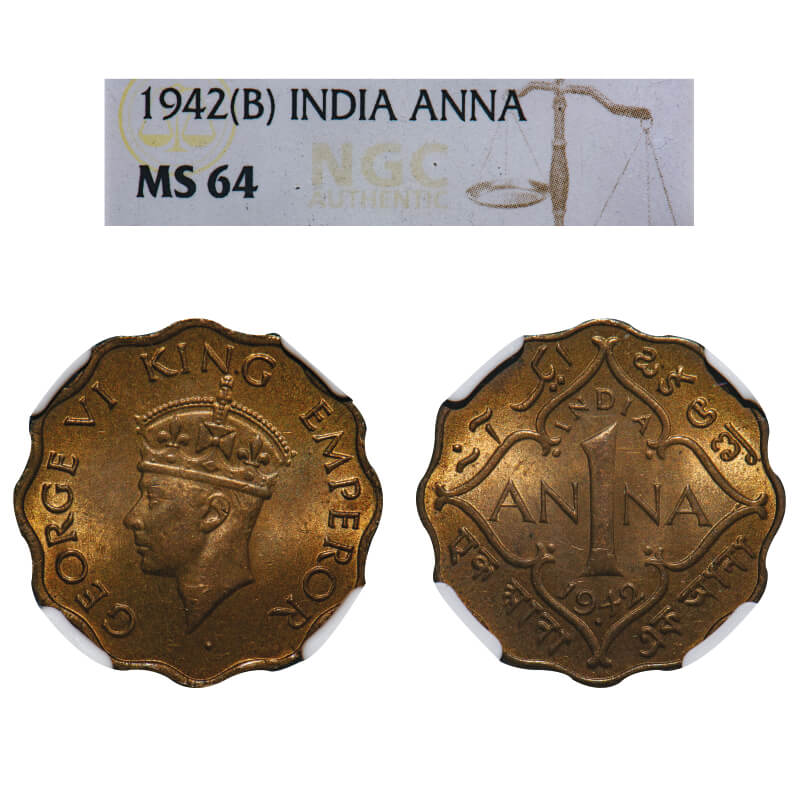 George VI, Nickel-Brass, 1 Anna, 1942, Bombay Mint, Dot, Head Type II. F. Prid 976. GK 1388. NGC Slabbed MS 64. Extremely Rare.