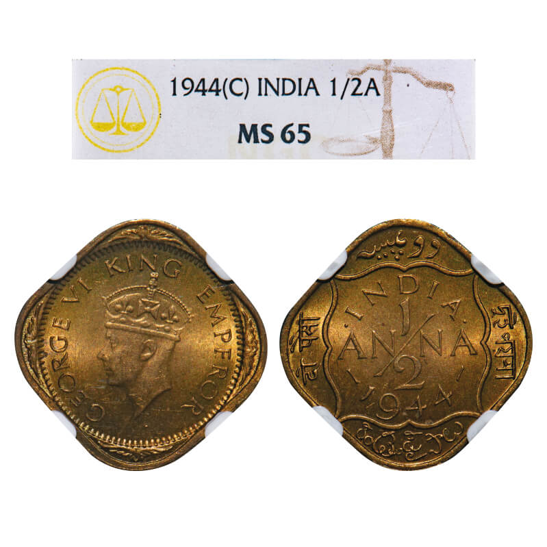 George VI, Nickel-Brass, 1/2 Anna, 1944, Calcutta Mint, Dots by India, Dashes by year, Single mint coin. F. Prid 985. GK 1408. NGC Slabbed MS 65. Extremely Rare.