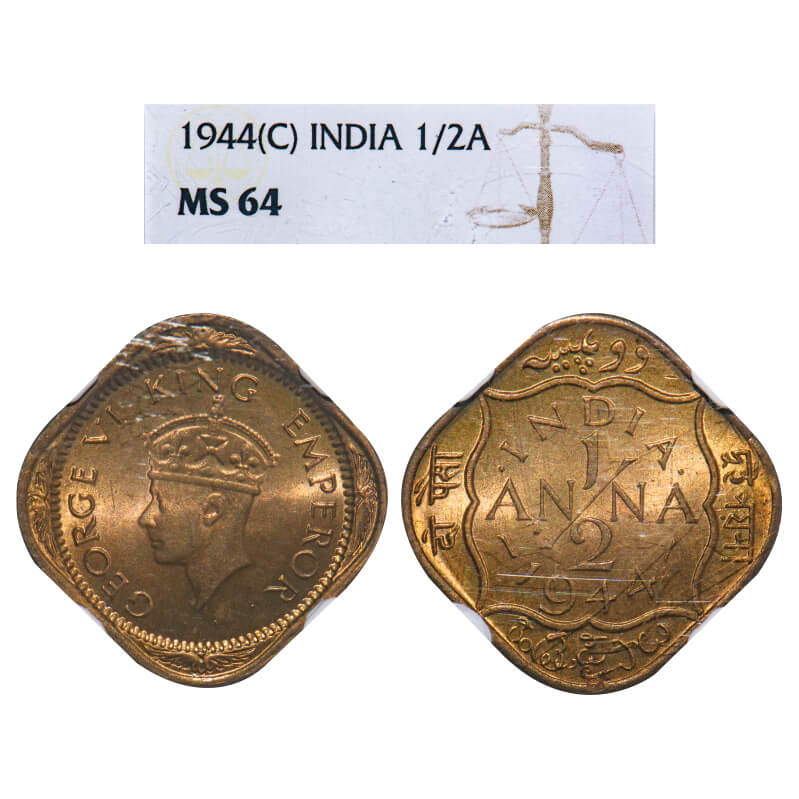 George VI, Nickel-Brass, 1/2 Anna, 1944, Calcutta Mint, Dots by India, Dashes by year. F. Prid 985. GK 1408. NGC Slabbed MS 64. Rare.