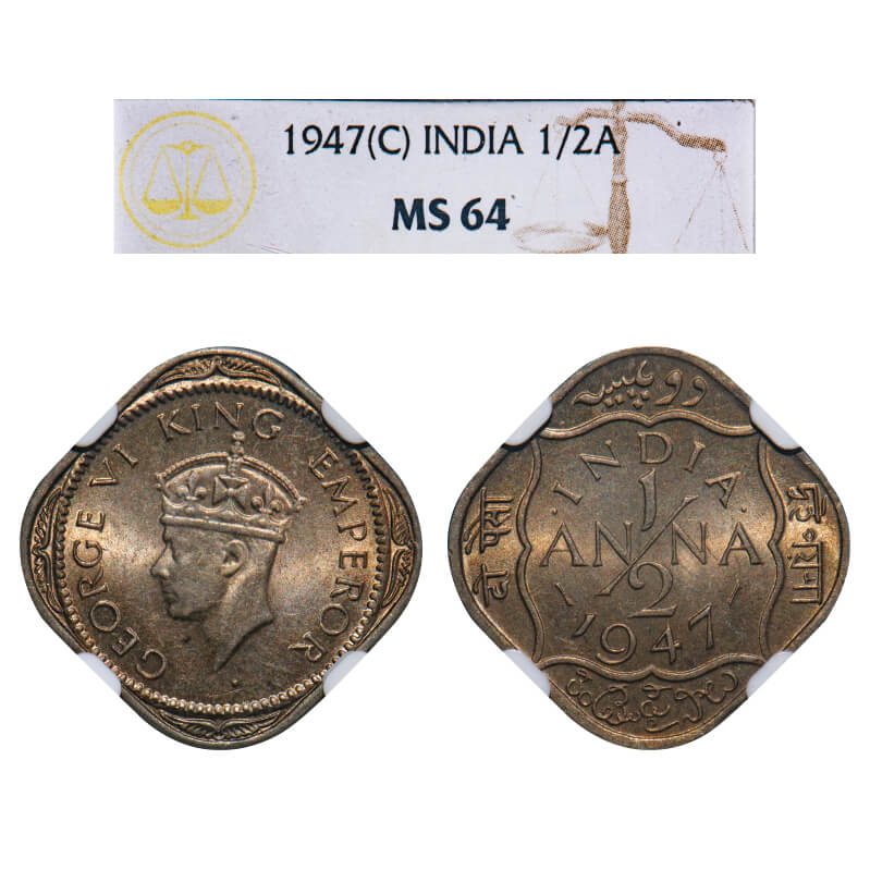 George VI, Copper-Nickel, 1/2 Anna, 1947, Calcutta Mint, Dots by India, Dashes by year. F. Prid 989. GK 1417. NGC Slabbed MS 64. Extremely Rare.