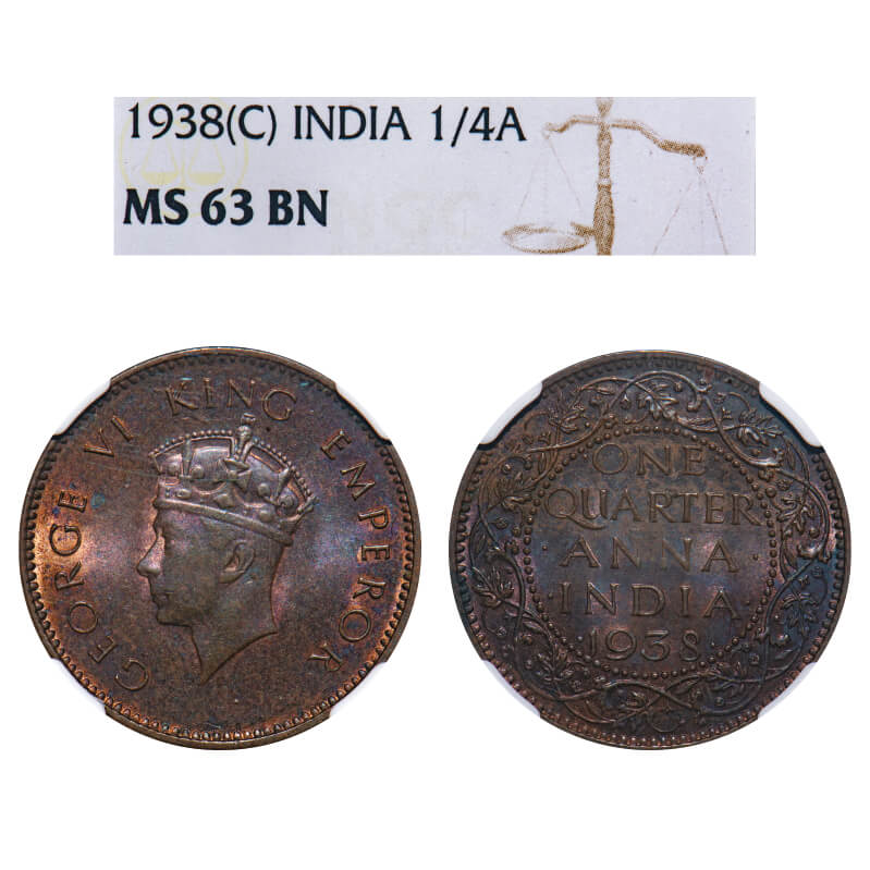 George VI, Bronze, Quarter Anna, 1938, Bombay Mint, Dot, Head Type I, Dots by ONE, Small year numer...