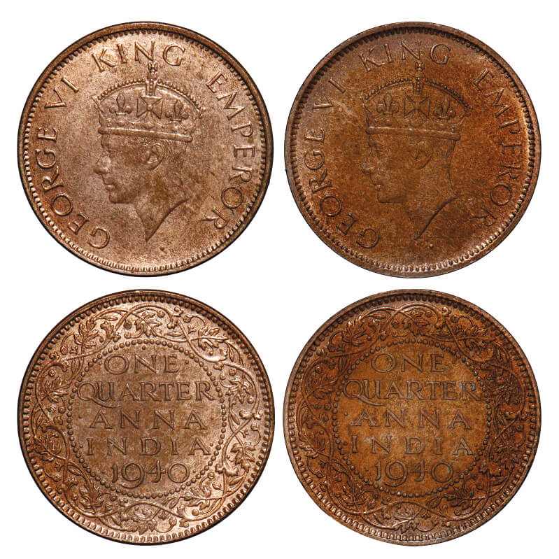 | George VI, Bronze, Quarter Anna, 1940, (2 coins), 1) Bombay Mint, Head Type II, Dot, 2) Calcutta Mint, Head Type II, No dot. F. Prid 692, 686. GK 1426, 1427. Brilliant Uncirculated to Mint State. Scarce. |