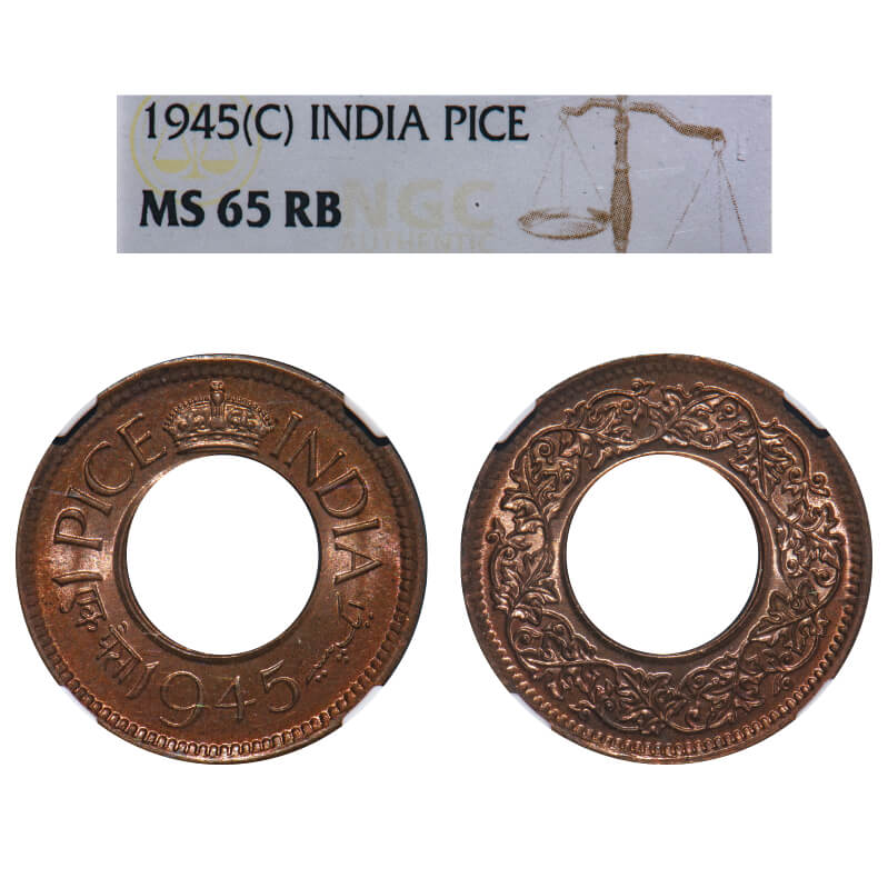 George VI, Bronze, 1 Pice, 1945, Calcutta Mint, No mint mark, Flat Crown. F. Prid 696. GK 1445. NGC Slabbed MS 65 RB. Extremely Rare.