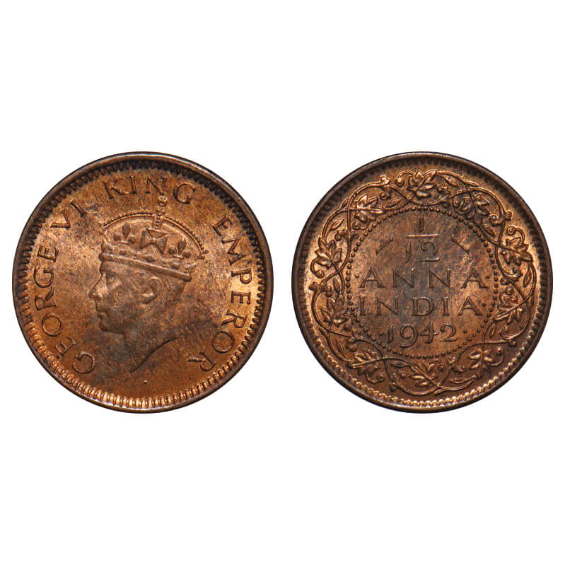 George VI, Bronze, 1/12 Anna, 1942, Bombay Mint, Dots by year, Head Type II. F. Prid 863. GK 1458. Mint State. Rare.