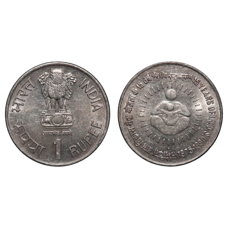 1 Rupee, 1990, Cu-Nic, 15 years of I.C.D.S. Bombay Mint. Uncirculated, Scarce.