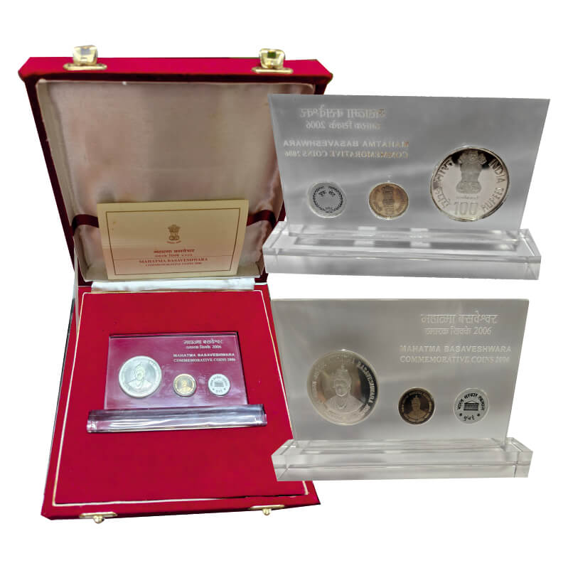 2006, Proof Set of 2 Coins (presentation Box), 100 & 5 Rupees, Mahatma Basaveshwara, Mumbai Mint. in original acrylic stand within Red Velvet box with certificate. S.Reddappa 25.47 type. Proof, Scarce.