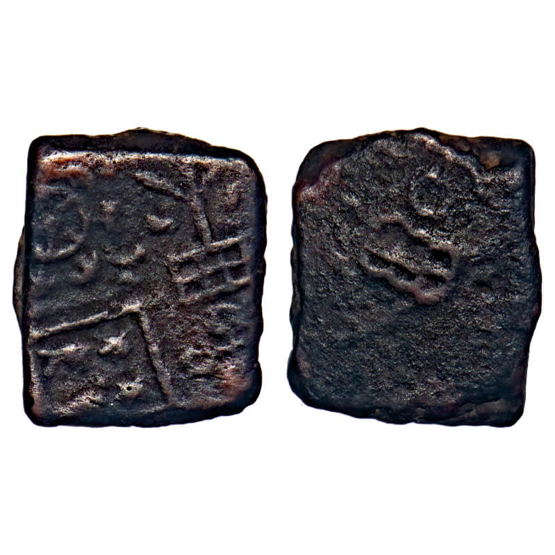 | Post Mauryan (c. 250 - 200 BC), Vidisha - Eran region of central India (MP), Uninscribed die-struck, Copper, 3.14gm, 14.80x12.50mm, Obv: Four symbols - fishes and turtles in a rectangular pond, six arms wheel, tree in railing, Ujjain symbol, Rev: Symmetrical symbol resembling to Caduceus, Ujjain symbol. Very Fine. Very Scarce. |