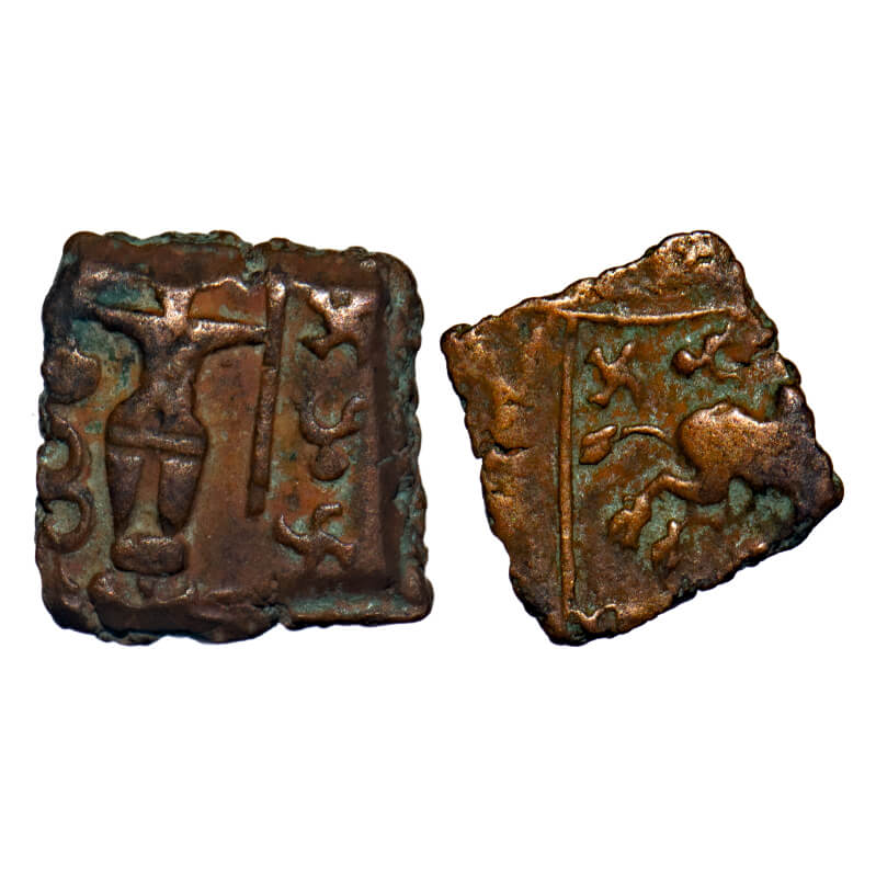 | Pre-Satavahana, Vidarbha Region, Uninscribed type, Copper Unit, 1.06gm, 11.20x12.16mm, Obv: A male deity standing on platform, holding dand in right hand and other object in left hand, four circles on left side and on right side panel of swastika and taurine from bottom to top, Rev: Running bull to right side above swastika and taurine symbol within square area. Unlisted in Pieper. Very Fine, Rare. |