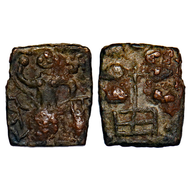 | Post Mauryan, Vidarbha region, 'Sri GOLA', referred as river Godavari in early ancient texts (c. 200 - 150 BC), 2.18gm, 13.66x11.43mm, Obv: Female deity depicting river Godavari, standing with one hand raised and other on waist, Swastika on upper right and triangle-headed standard on lower right with Brahmi legend 'SIRI GOLA' to left reading inside-out, Rev: Tree with bold leaves in railing. Pieper # 2514. Very Fine, Very Rare. |