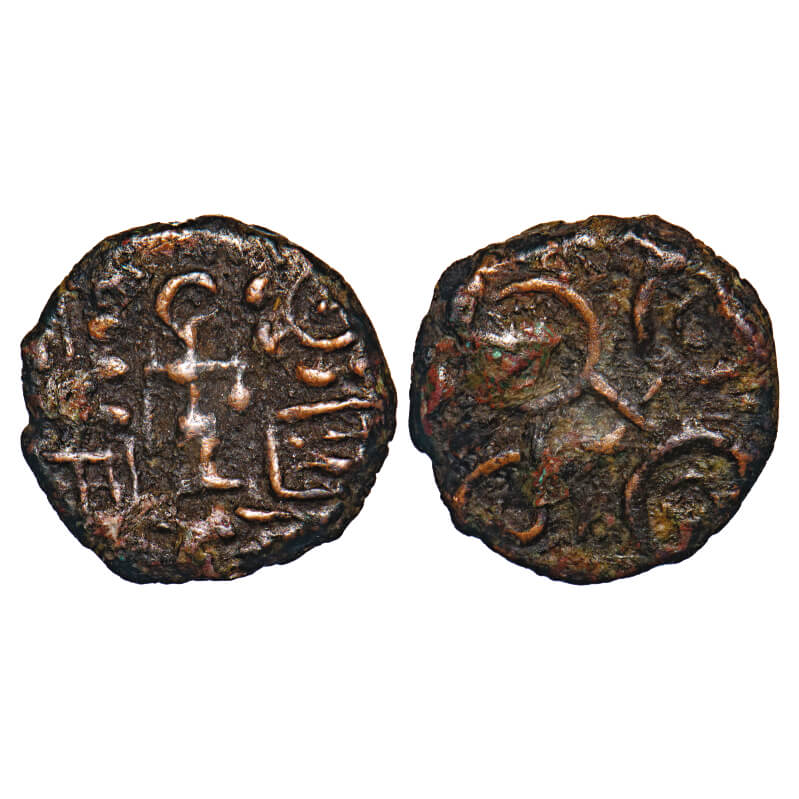 | Post-Mauryan, Ujjaini Region (c. 200 BC), Uninscribed type, Copper Unit, 2.17gm, 13.98x14.48mm, Obv: Mahakal standing holding stick and kamandalu in his hand, front of six armed wheel and fish tank, behind tree-in-railing, Rev: Double orbed symbol. Very Fine, Scarce. |