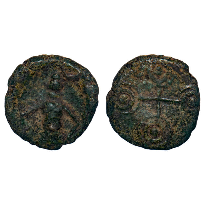 | Post-Mauryan, Ujjaini Region, Uninscribed type, Copper Unit, 3.56gm, 16.90x16.40mm, Obv: Mahakal standing holding stick and water pot in hand with traces of other symbols, Rev: Double orbed ujjaini symbol solid dot in each orb. Type is unlisted in Pieper. Very Fine, Scarce. |