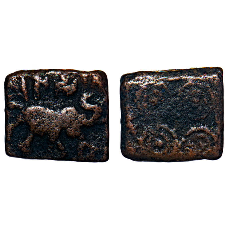 | Satavahanas, Siri Satakarni (c. 100 BC), Vidarbha Region, Copper Unit, 1.51gm, 10.66x12.08mm, Obv: Elephant walking to right side with trunk upraised and above Brahmi legend, Rev: Double orbed ujjaini symbol. Pieper # 2689. Very Fine, Scarce. |