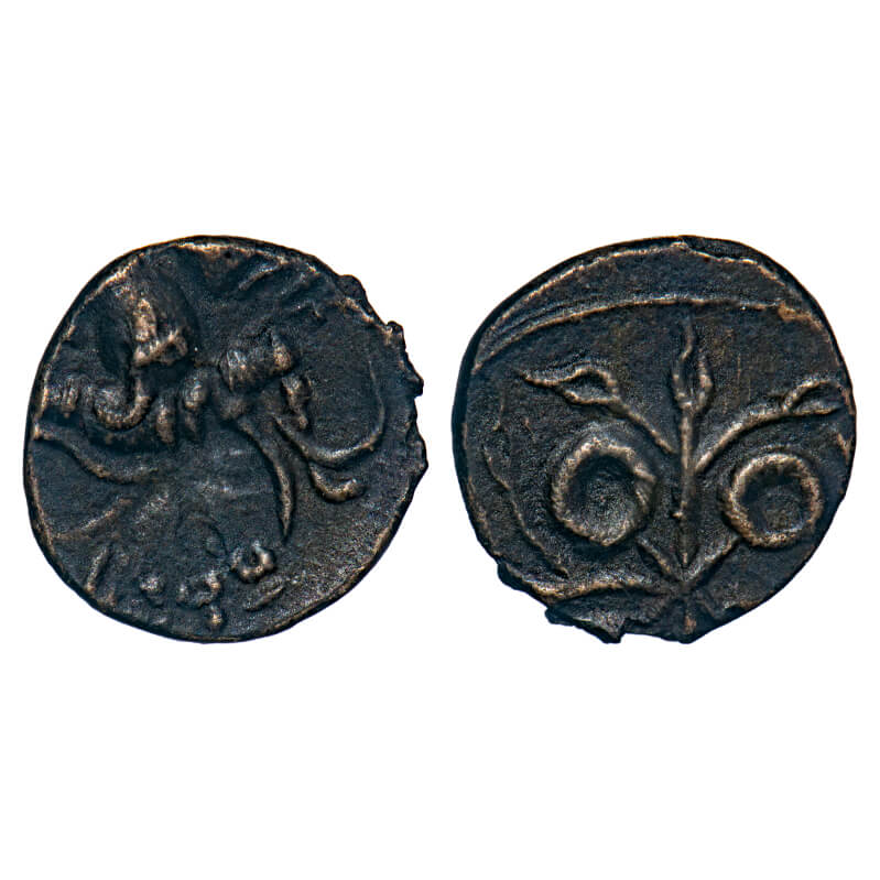 | Satavahanas, Gautamiputra Siri Satakarni (c. 60-84 AD), Copper Unit, Nasik Region, 1.57gm, 15.16x15.37mm, Obv: Elephant walking to right side with trunk upraised and around Brahmi legend, Rev: Tree-in-railing with four orbed ujjaini symbol. Very Fine, Scarce. |