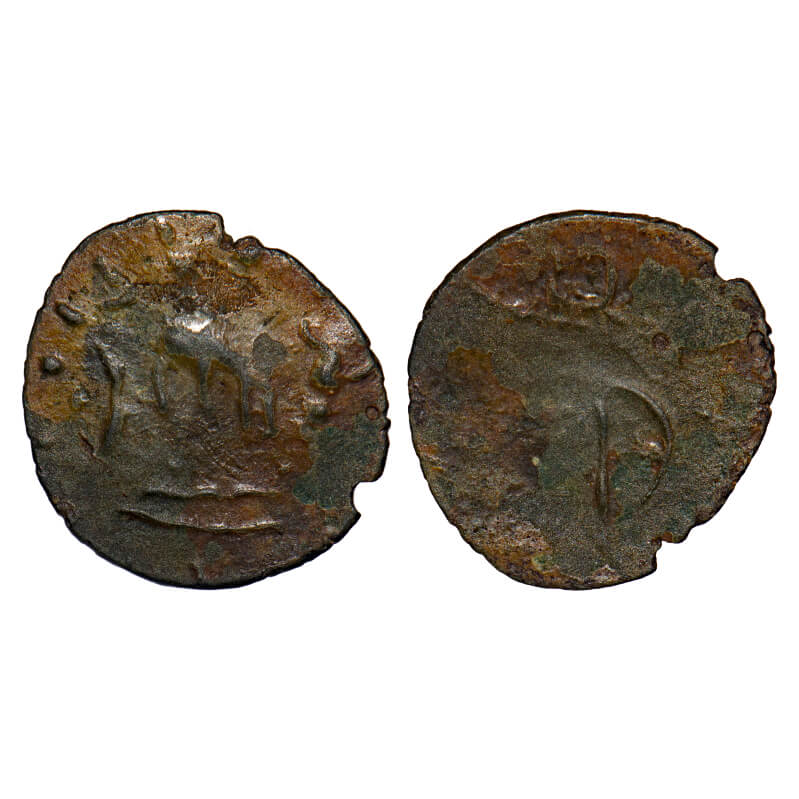 Post Satavahanas, Kadambas of Banvasi Region, Potin Unit, 1.27gm, 19.25x18.48mm, Obv: Bull walking to right below wavy line and above crude Brahmi legend, Rev: bow and arrow. Pieper # 2119. About Very Fine, Scarce.